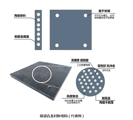 熔瓷耐磨襯板由耐磨陶瓷骨料和高韌金屬基構(gòu)成,巧妙的強(qiáng)化了成分材料的各自優(yōu)點(diǎn),避開(kāi)了各自的弱點(diǎn),解決了陶瓷耐磨不抗沖擊,金屬有韌性而不耐磨的組合難題。